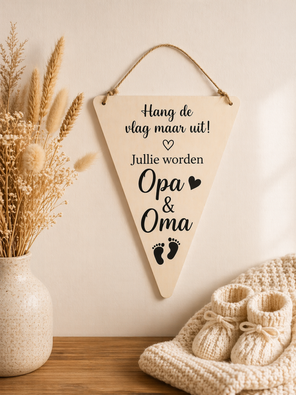 Maak de geboorte van jullie kindje extra bijzonder met dit schattige houten vlaggetje “Hang de vlag maar uit! Jullie worden Opa & Oma”. Een origineel en liefdevol cadeau om het mooie nieuws op een unieke manier aan te kondigen.